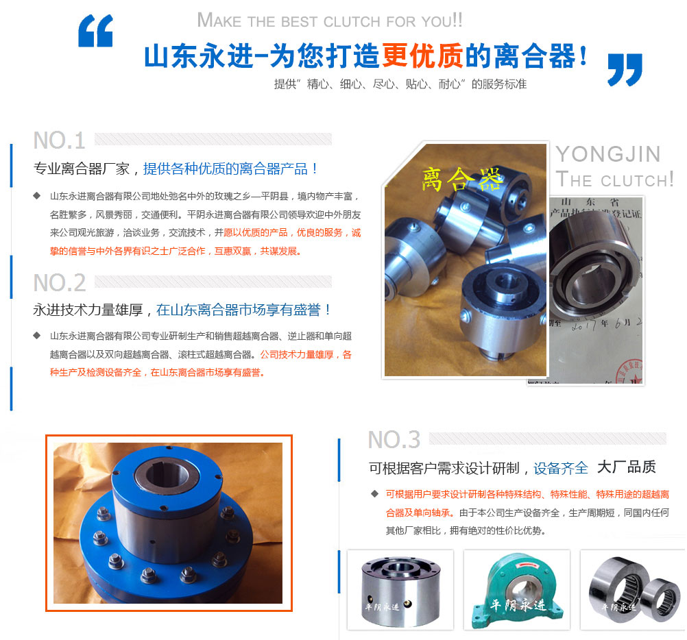 山東永進(jìn)離合器有限公司地處平陰縣,主營(yíng)各類(lèi)離合器的銷(xiāo)售生產(chǎn)與研發(fā),產(chǎn)品種類(lèi)有單向離合器、雙向離合器、超越離合器、單向超越離合器、雙向超越離合器等產(chǎn)品,在山東離合器市場(chǎng)享有盛譽(yù),工廠(chǎng)技術(shù)力量過(guò)硬,工藝嚴(yán)謹(jǐn),各道工序配有專(zhuān)職檢驗(yàn)人員。設(shè)備精良、產(chǎn)品具有高精度、高運(yùn)轉(zhuǎn)性、低噪音、低振動(dòng)、低摩擦力、高密封性、長(zhǎng)壽命等性能。廣泛應(yīng)用于礦機(jī)設(shè)備、輸送設(shè)備、減速機(jī)、節(jié)能設(shè)備、紡織機(jī)械、印刷機(jī)械、自動(dòng)生產(chǎn)線(xiàn)等行業(yè)。產(chǎn)品銷(xiāo)往國(guó)內(nèi)。 工廠(chǎng)位于弛名中外的玫瑰之鄉(xiāng)---平陰縣境內(nèi),平陰縣物產(chǎn)豐富,風(fēng)景秀麗,交通方便。公司領(lǐng)導(dǎo)歡迎中外朋友來(lái)公司觀(guān)光旅游,洽談業(yè)務(wù),交流技術(shù),并愿以過(guò)硬的產(chǎn)品,優(yōu)良的服務(wù),誠(chéng)摯的信譽(yù)與中外各界有識(shí)之士廣泛合作,互惠雙贏(yíng),共謀發(fā)展。“本宗”超越離合器及軸承以“向用戶(hù)提供信得過(guò)的產(chǎn)品和服務(wù)”為根本宗旨,努力滿(mǎn)足您的要求,與您共創(chuàng)事業(yè)輝煌。公司部分產(chǎn)品如下:1、CKA型、CKB型、CKC型、CKE型主要...