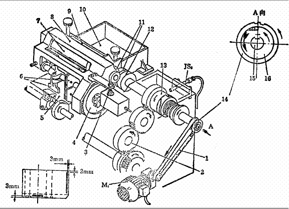 電動(dòng)機(jī)M1 的作用是在停車時(shí)帶動(dòng)上、下兩膠輥和涂膠輪轉(zhuǎn)動(dòng),防止膠水干結(jié),以便再次起動(dòng)時(shí)能正常工作。當(dāng)機(jī)器在操作者或安全裝置引起停車的情況下,間隔一定的時(shí)間后(該時(shí)間由定時(shí)器控制),擺動(dòng)架8由氣缸3推頂,并繞上膠輥7轉(zhuǎn)動(dòng),使涂膠輪6與商標(biāo)紙5脫離接觸。同時(shí),電動(dòng)機(jī)M1起動(dòng),并獨(dú)立驅(qū)動(dòng)涂膠器。電動(dòng)機(jī)M1的動(dòng)力經(jīng)蝸輪箱帶動(dòng)同步帶1傳動(dòng)后,由同步帶輪14按圖中A向視圖的細(xì)箭頭驅(qū)動(dòng)單向超越離合器16轉(zhuǎn)動(dòng),并通過鍵連接,帶動(dòng)軸15,使涂膠器轉(zhuǎn)動(dòng)。此時(shí),牙嵌離合器是斜面嚙合,離合器打滑,齒輪13就不轉(zhuǎn)動(dòng),這樣就保證了停車時(shí)電動(dòng)機(jī)M1獨(dú)立驅(qū)動(dòng)涂膠器。