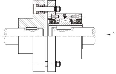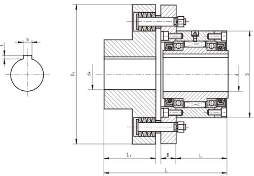 CKL-B為帶半聯(lián)軸器(彈性套柱銷聯(lián)軸器)的非接觸楔塊式單向超越離合器。內(nèi)含軸承支撐。主要用在超越轉(zhuǎn)速較高,楔合后轉(zhuǎn)速較低的雙速驅(qū)動(dòng)場合。使用時(shí)需要提供潤滑油脂。